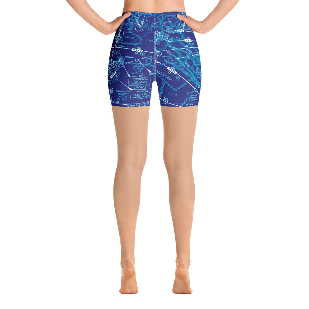 Super comfy body-flattering yoga shorts featuring Enroute Low Altitude (ELUS1) Chart (northwest). They come with a high waistband and are made from soft microfiber yarn. Elevate your style and let comfort take the pilot seat.