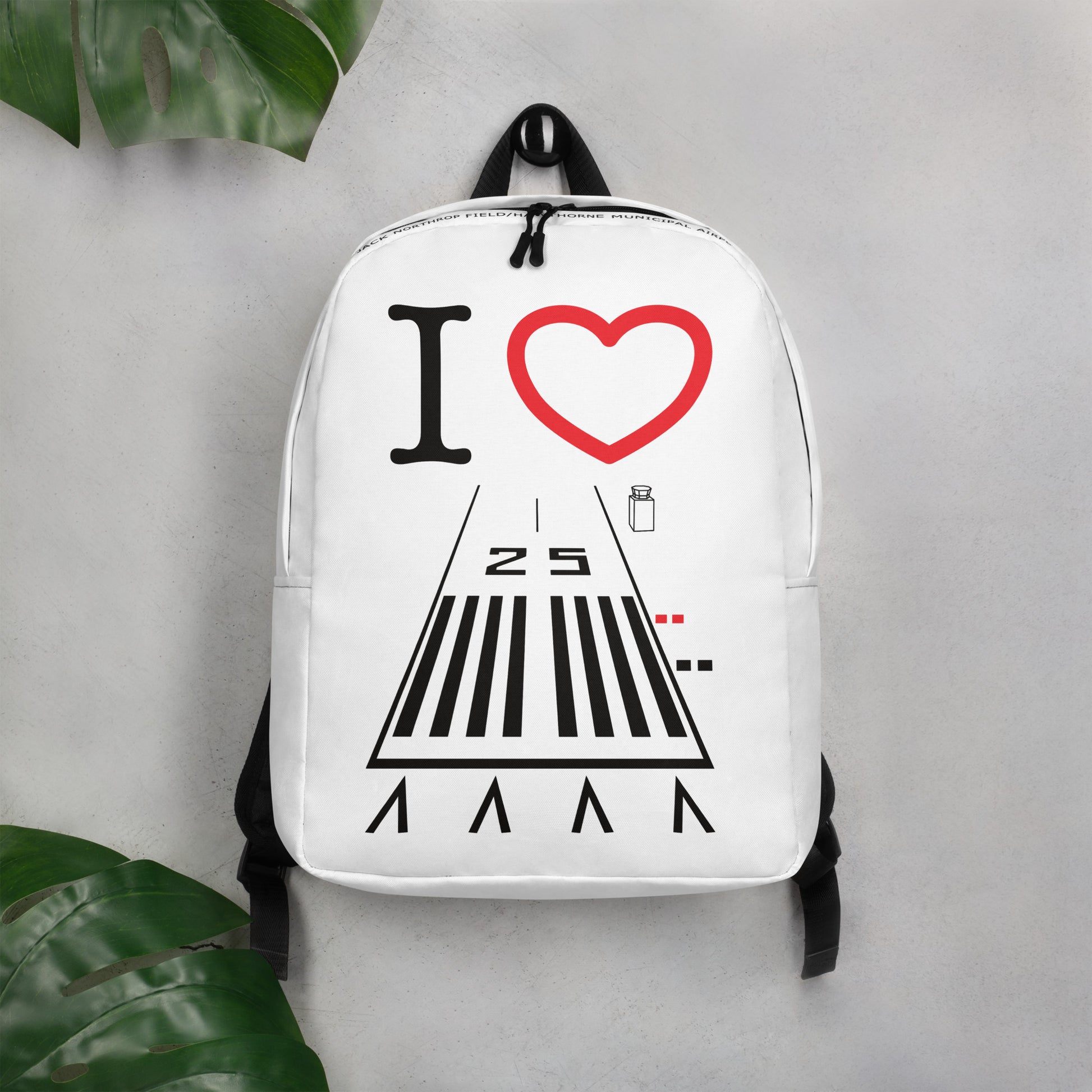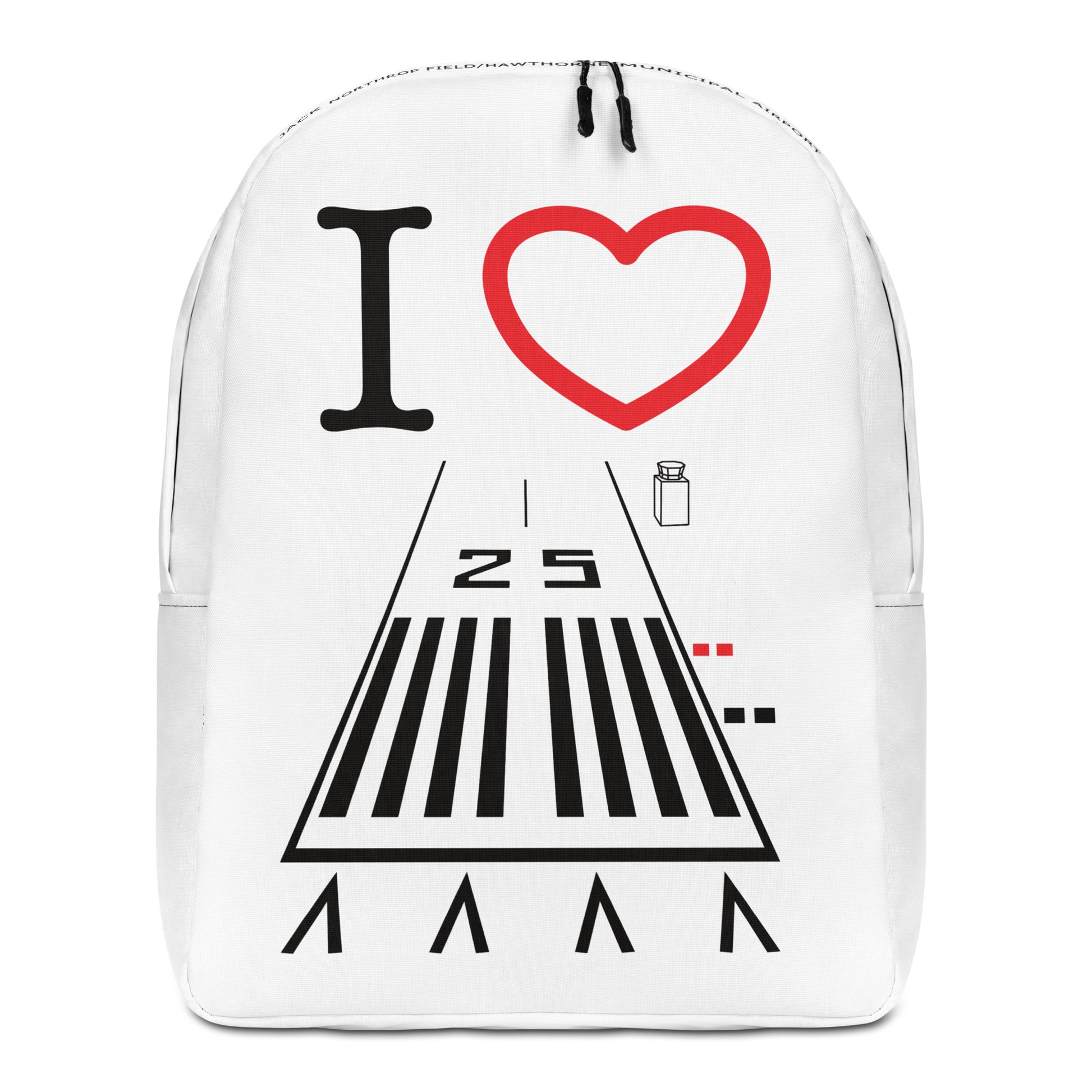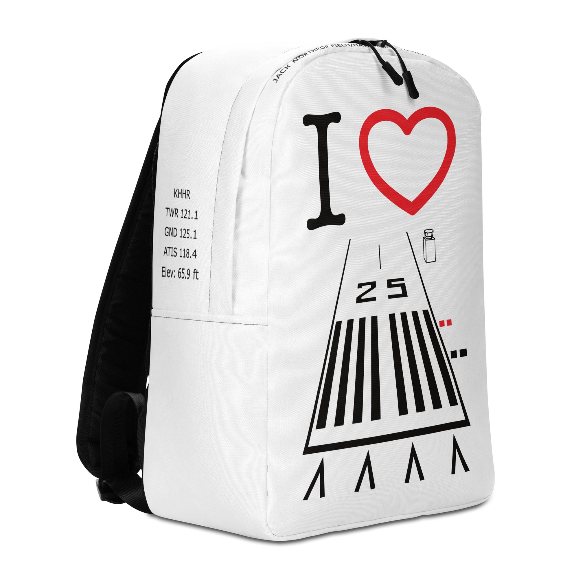 I ❤️ Hawthorne Airport Runway 25 white minimalist backpack with tower, ground and ATIS frequencies, runway length and "Jack Northrop Field/Hawthorne Municipal Airport" on the top of the bag.