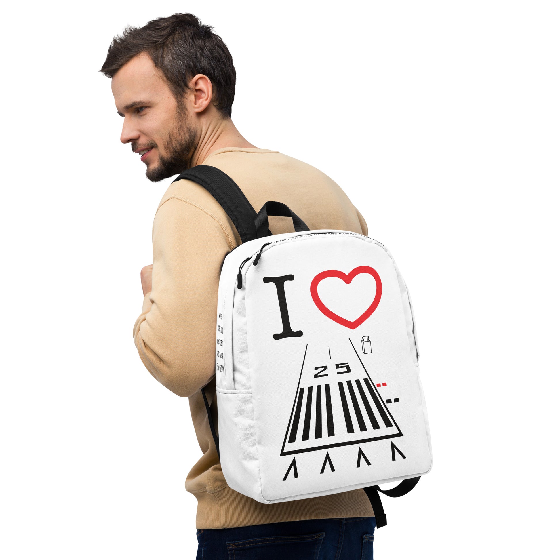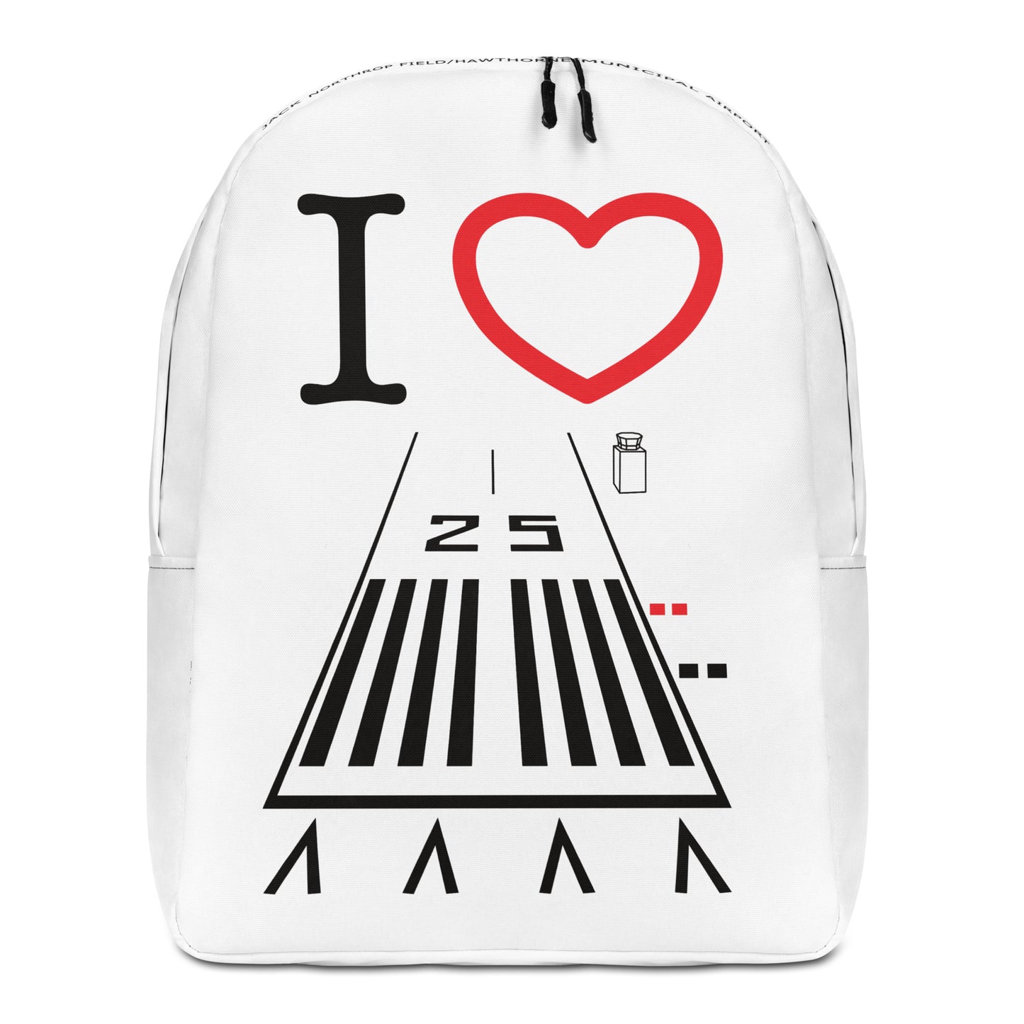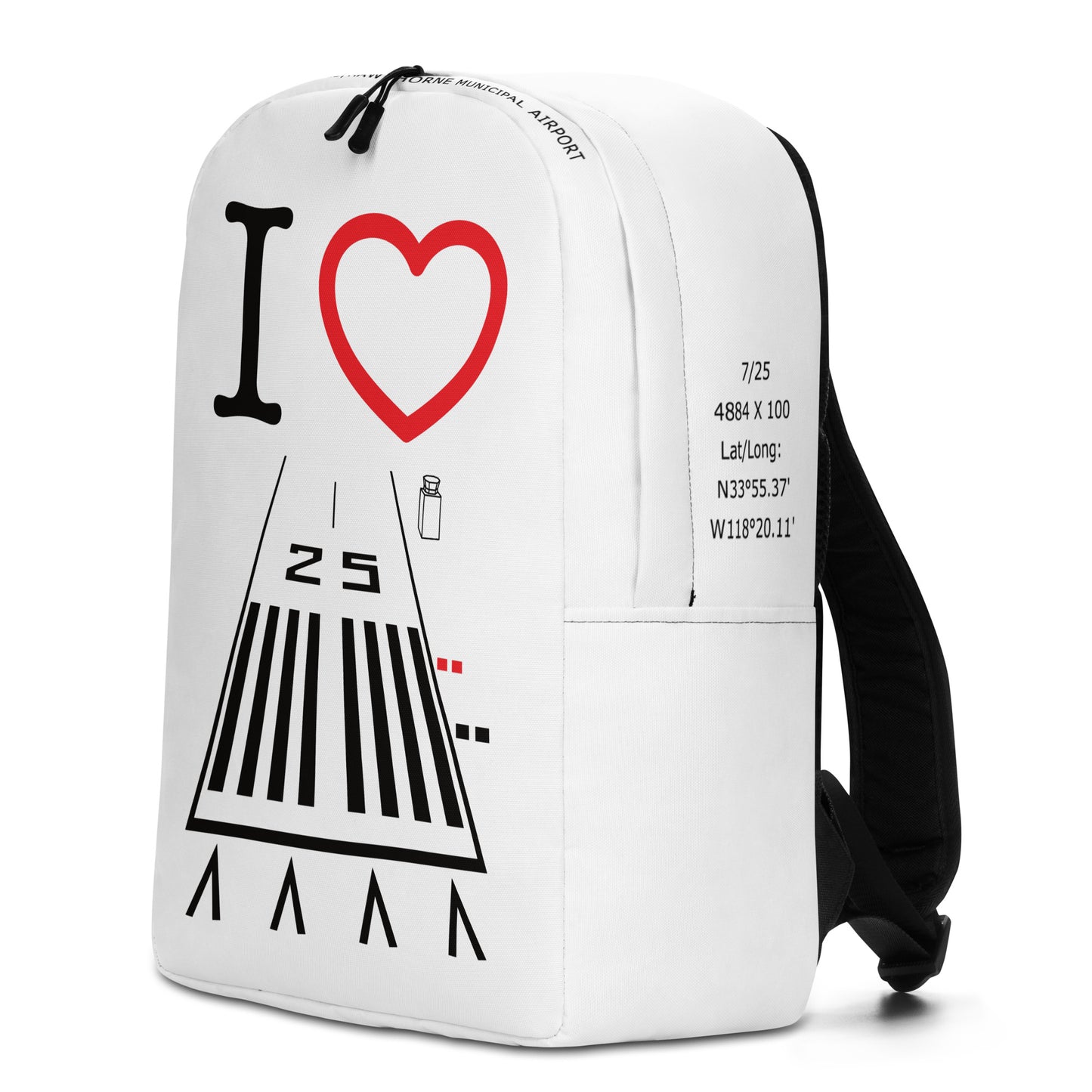 I ❤️ Hawthorne Airport Runway 25 white minimalist backpack with tower, ground and ATIS frequencies, runway length and "Jack Northrop Field/Hawthorne Municipal Airport" on the top of the bag.