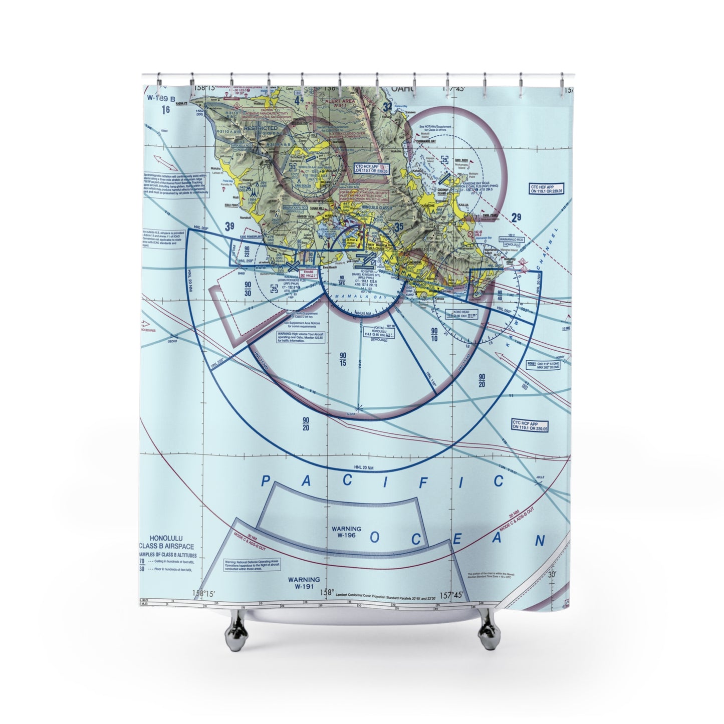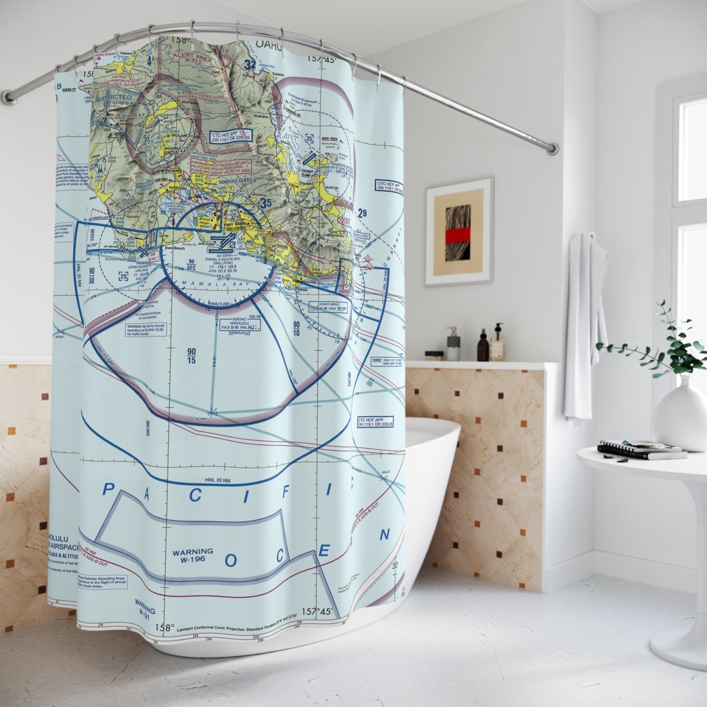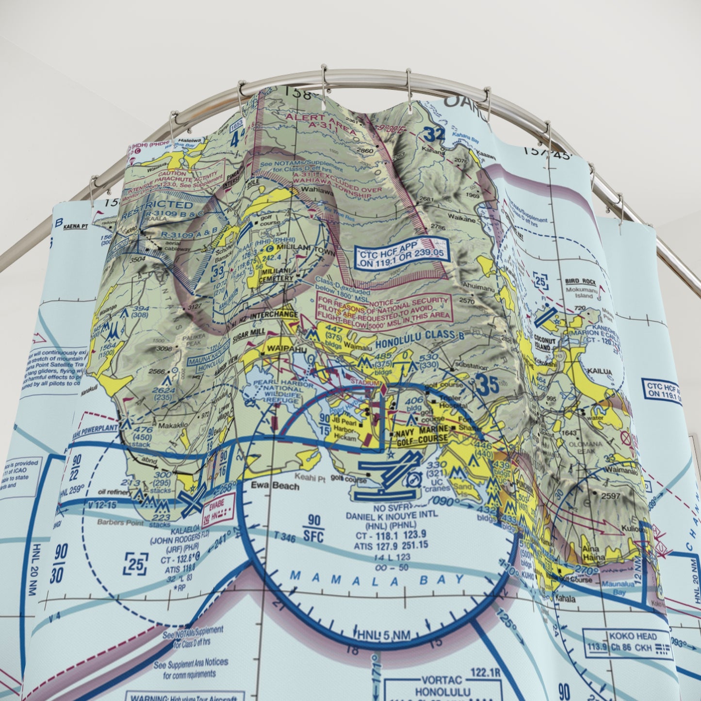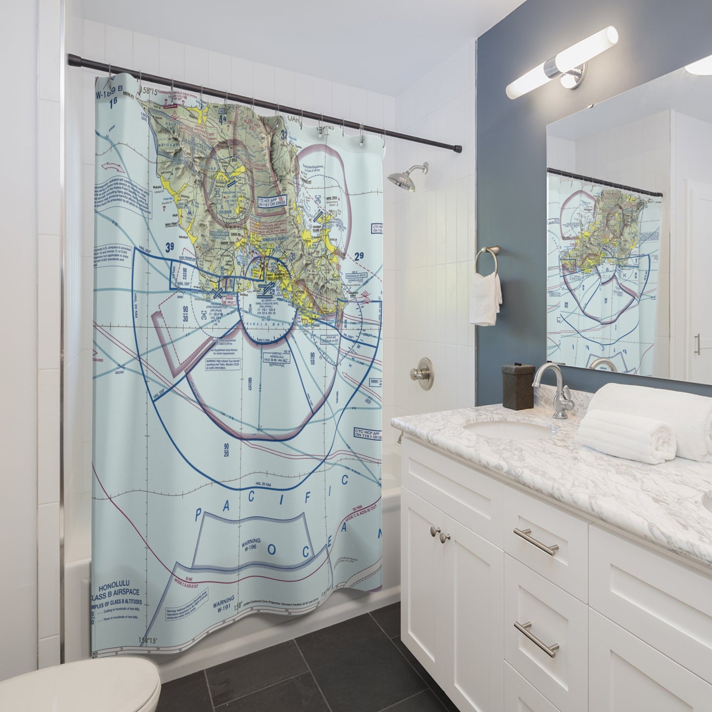 Introducing our quality shower curtain featuring Honolulu's Daniel K Inouye International Airport (HNL) Sectional Chart. It's the perfect way to navigate your daily shower with a touch of aviation adventure. Get ready for a clear takeoff into the day ahead!