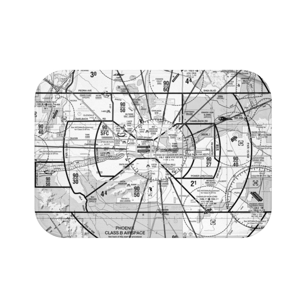 Stylish bath mat featuring the Phoenix Sky Harbor International Airport (PHX) Terminal Area Chart (TAC). Anti-slip backing keeps the mat in place and reduces the risk of slipping.