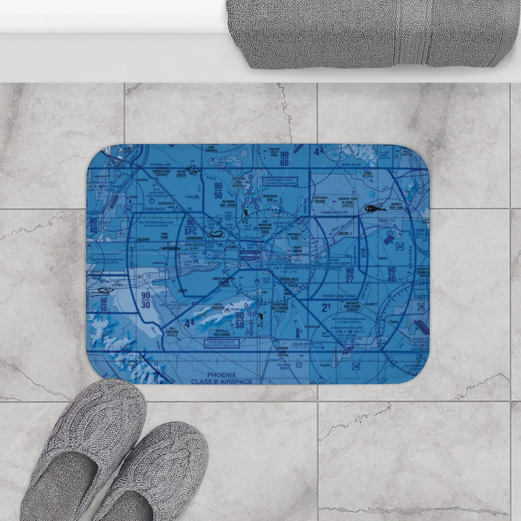 Stylish bath mat featuring the Phoenix Sky Harbor International Airport (PHX) Terminal Area Chart (TAC). Anti-slip backing keeps the mat in place and reduces the risk of slipping.