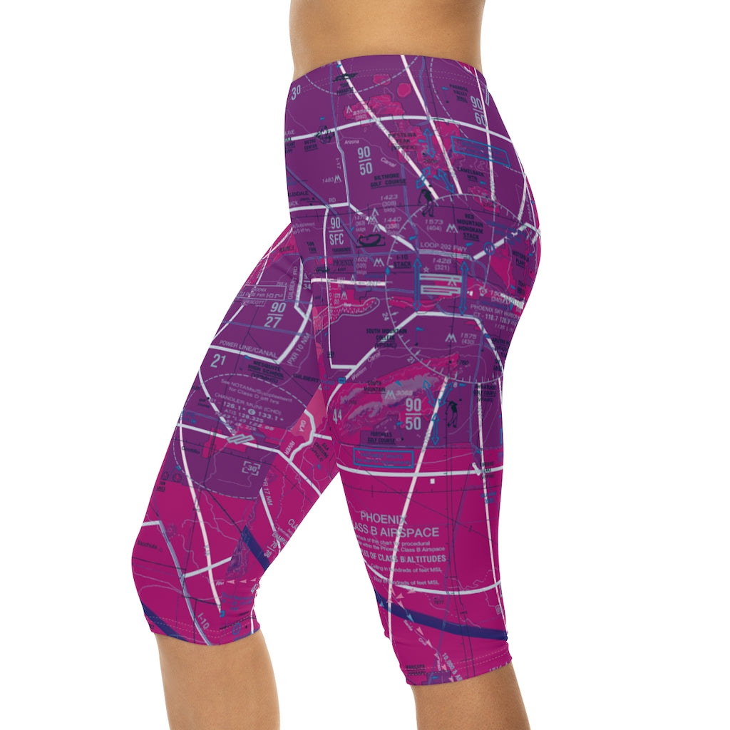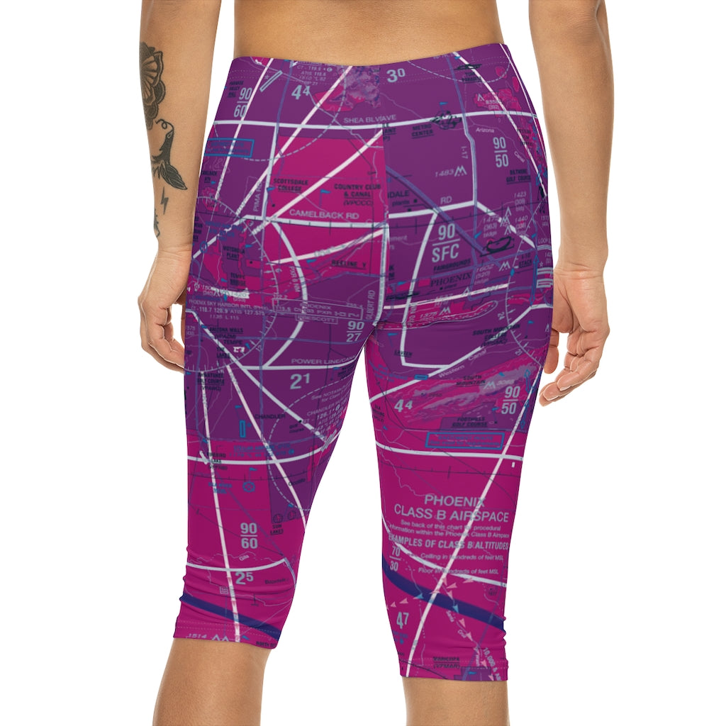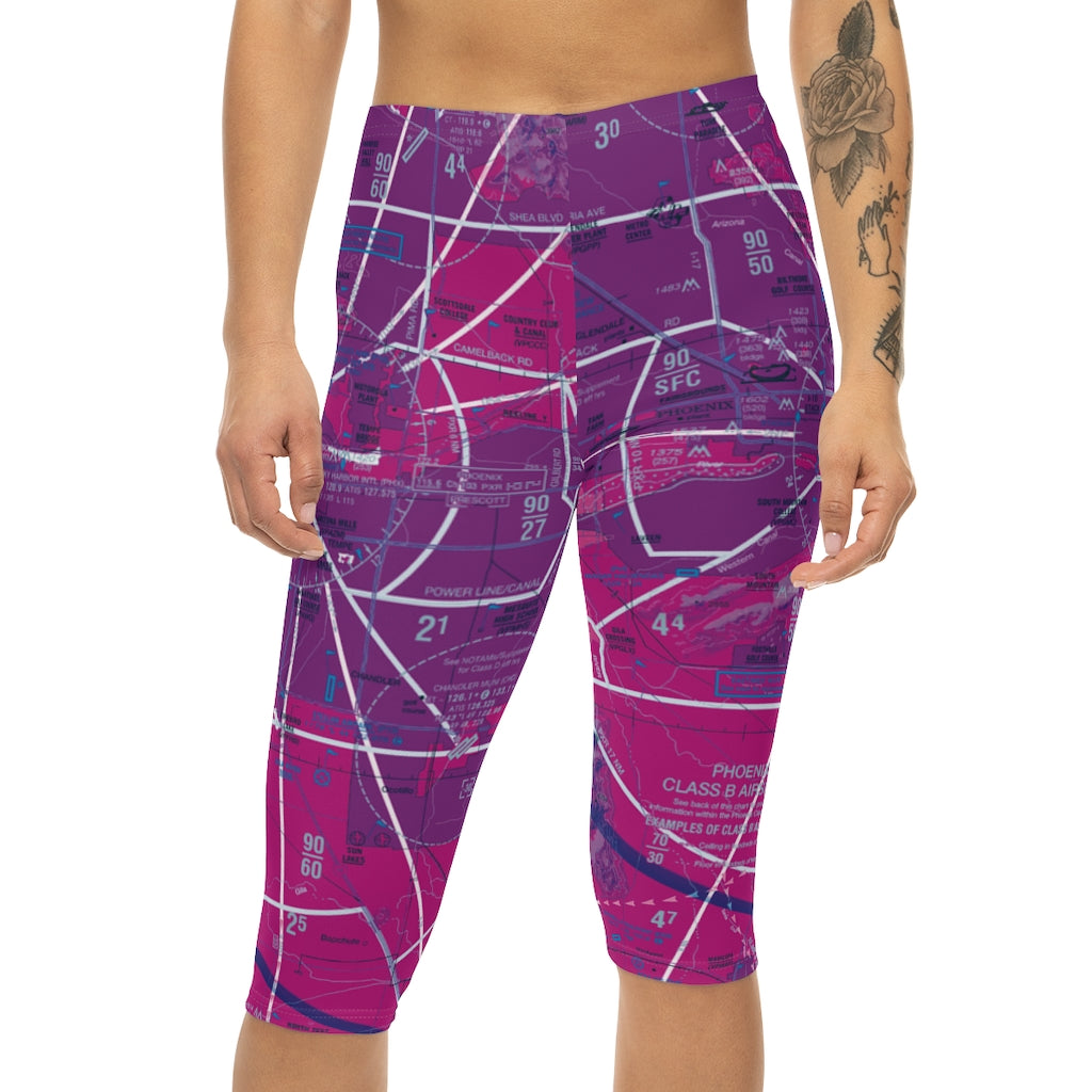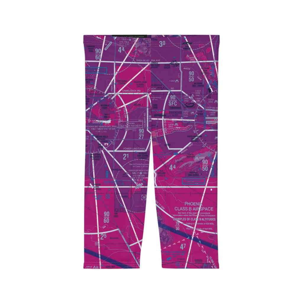 Stylish capri leggings featuring the Phoenix Sky Harbor International Airport (PHX) Terminal Area Chart (TAC). Made with anti-microbial polyester spandex that is both moisture-wicking and breathable, these leggings come with a mid-rise waist and are the perfect choice for a little pattern work on warm days, lounging at the hangar, or sweating it out at the gym.